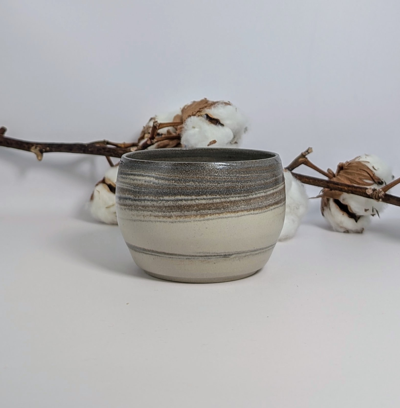 Toutes les pièces de la collection TIERRA sont entièrement réalisées à la main et émaillées afin de faire ressortir les nuances des trois terres à grès utilisées. Grâce à la technique japonaise du neriage les terres se mêlent de manière aléatoire, sous mes mains lors du tournage, laissant apparaitre un motif unique.