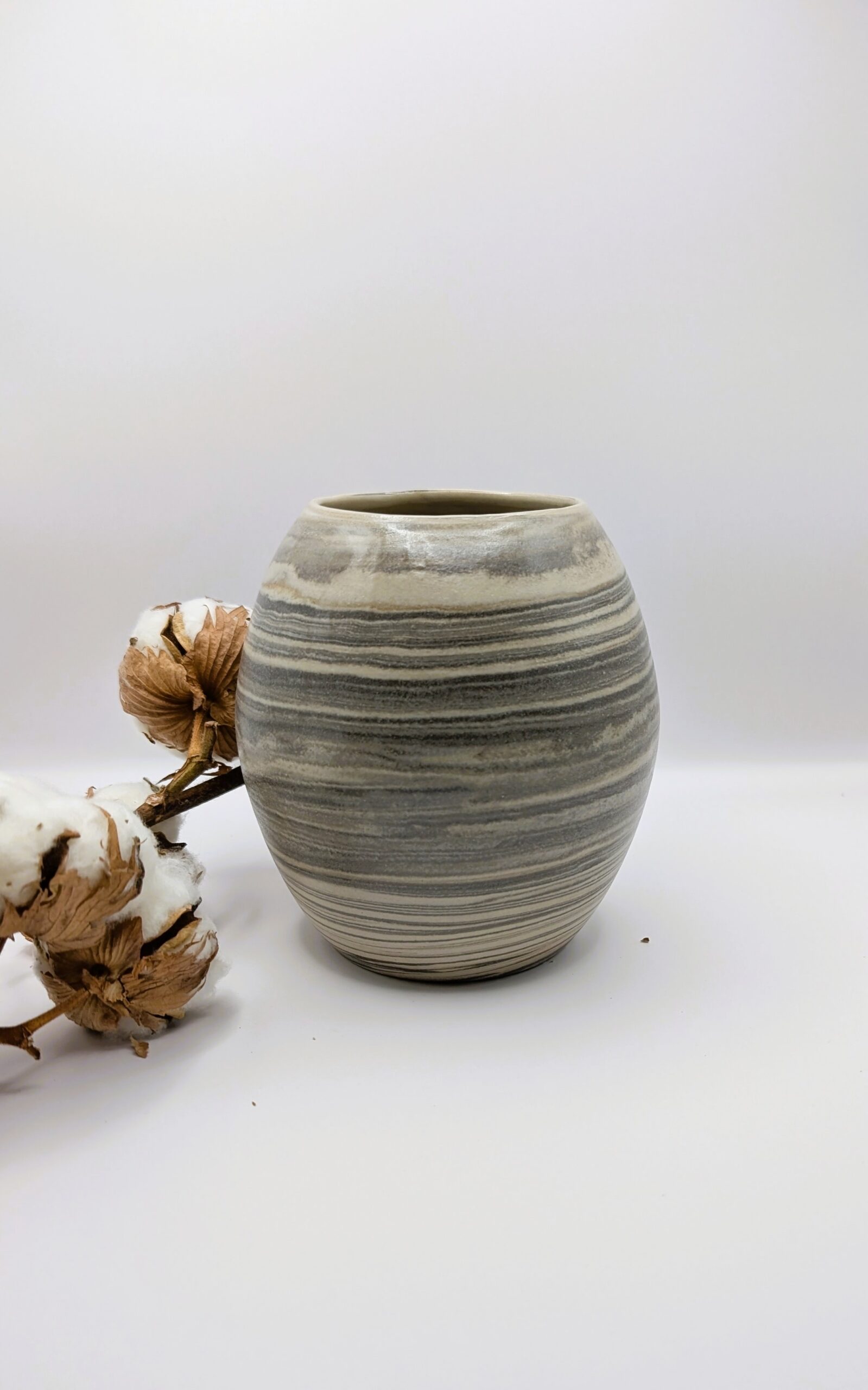 Ce vase est entièrement émaillé avec un émail transparent brillant ce qui lui permet de recevoir de l’eau et de faire ressortir les nuances des trois grès utilisés.